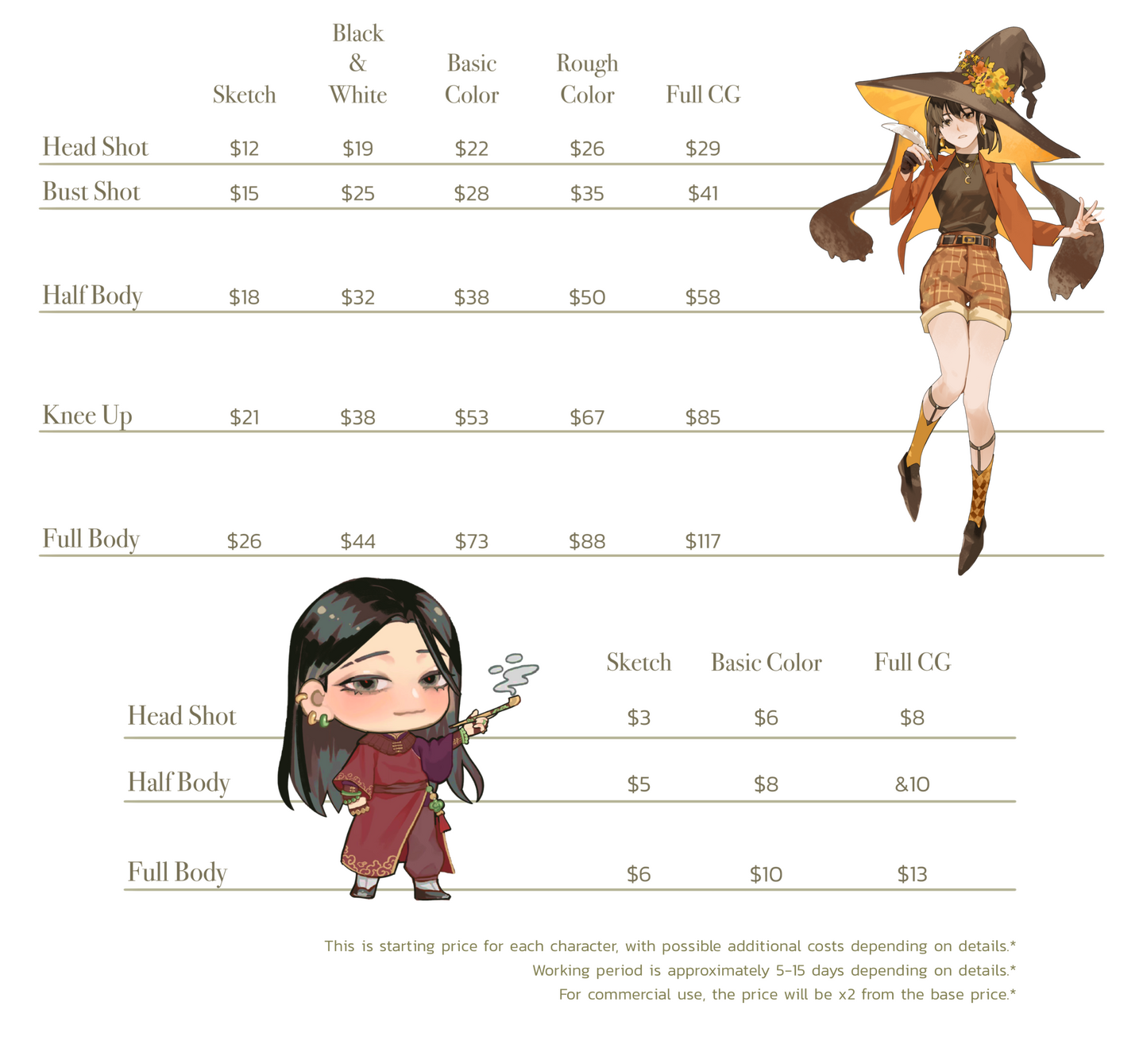 • Terms of use •-’Employer’ in this agreement refers to the client or employer, and ‘Contractor’ refers to the artist :Pakjit-Contact and book a queue via contact channels allowed; a coordination team will be available for the client throughout the work process instead of the contractor.-The work queue will be arranged according to the order in the checklist from the Google Form submitted by the client, based on the time of submission.-Always credit the artist when using (pakjitincanus) or tag Pakjit(FB page), @pakjitincanus(Twitter)-Employer allows Contractor to retain all artwork images for social media posting and future commission examples without requiring further permissions, (with the option for the employer to provide additional notification before finalizing the contract if needed)-The contractor's work in all phases may not be utilized by any party, including the employer, for AI-generated processes.**-The employer is prohibited from selling the work at a price higher than agreed upon with the contractor.-The employer can always inquire and request updates on the work for reassurance.-The contractor is a part of BlueCheese Studio, and the work process may involve collaboration with the BlueCheese Studio team in some stages to create artwork on behalf of Pakjit.• How to book your queue •-Discuss your rough idea or send your brief to check the price before making a decision without expenses.-Fill in the details via the Google Form in the booking category that is most convenient for the client to reserve a slot. The contractor will contact the client in the order of submission.-The client will pay the deposit and fill out the contract form, then wait for the work to begin according to the queue.-In the case where the client has paid the deposit but does not provide a briefing within 2 weeks after the deposit payment, and the contractor is unable to contact the client to reschedule for more than 3 days, the contractor reserves the right to cancel the booking without refunding the deposit and will move on to the next job in the queue.-If the client agrees to hire, they should fill out the contract form, which the contractor will send after the client has paid the deposit.-We will start working according to the queue and send updates to the employer to check the progress from time to time.-The working period is between 5-15 days per 1 piece depending on the details and corrections too.-We will send you a draft to check until it is passed. Then send the update again after coloring-The client is entitled to 3 free revisions of the draft. After coloring, 2 free revisions are allowed. If the number of revisions exceeds this or involves skipping steps, a fee of 50 Baht will be charged per revision. ***• Payment •-Accept Thai banking account, Promtpay, Truemoney wallet-Pay the deposit according to the terms in the booking form before the work begins. The remaining balance should be paid after the final work is inspected.-For installment, it can be agreed upon according to the convenience of the employer.-You can notify us to postpone the payment date beforehand in case of emergency-We have the right to make a claim and inquire about payment if it exceeds the payment deadline agreed by both parties.• Cancellation •-If you decide to cancel, notify us before updating the first draft to receive a full refund of the deposit.***-If the employer decides to cancel the job after the contractor has started working, as evidenced by updated drafts, the employer forfeits the deposit and the image rights remain with the contractor.***-We will not accept cancellation after starting the coloring process.***• Note •*** Indicates important information
