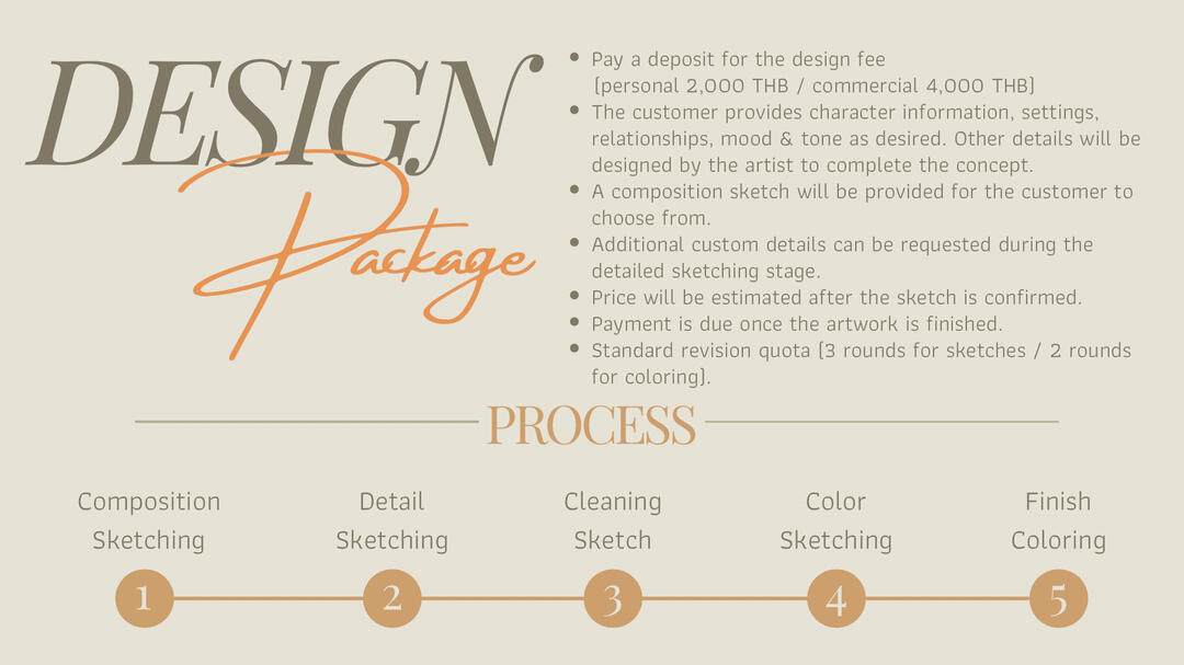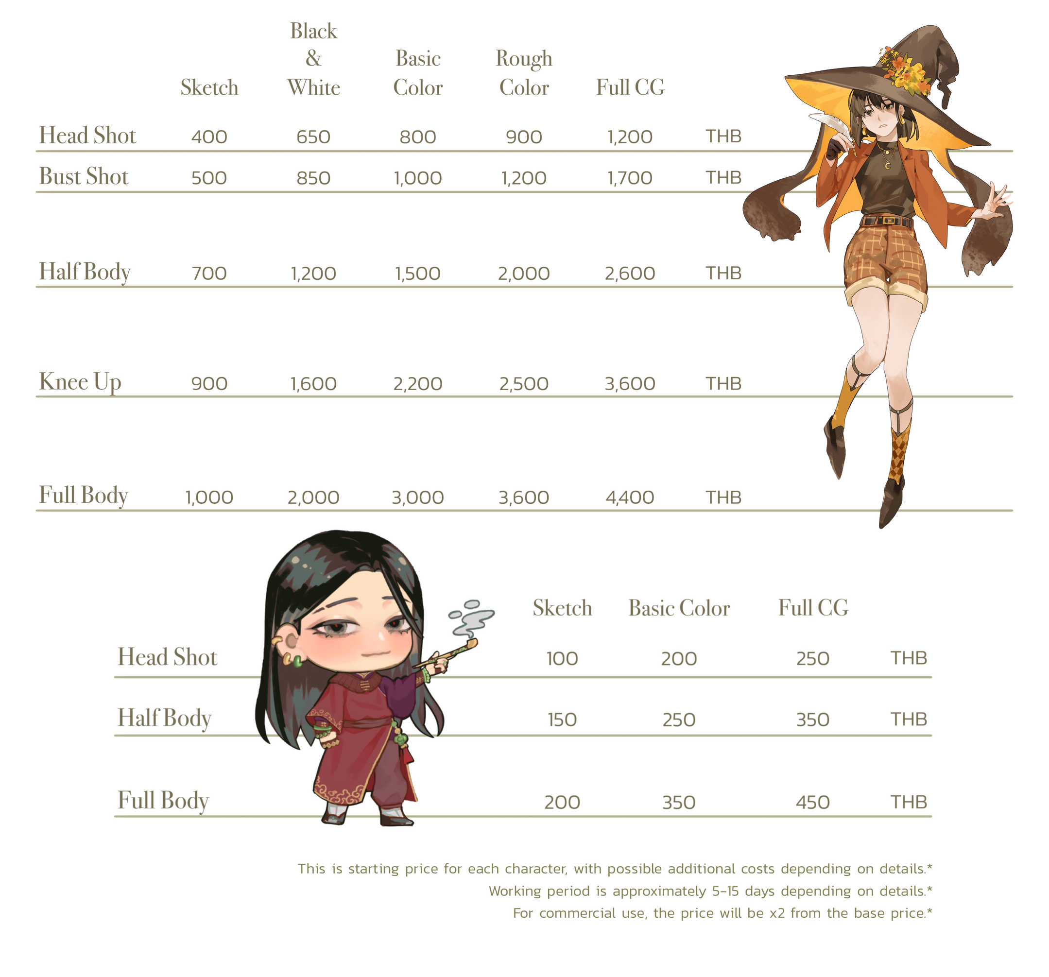 13. Any changes to pose, major composition, or important elements that require revisions to the sketch after the coloring stage are considered cross-stage revisions and will incur an additional fee of 100 THB per revision.***• Payment •